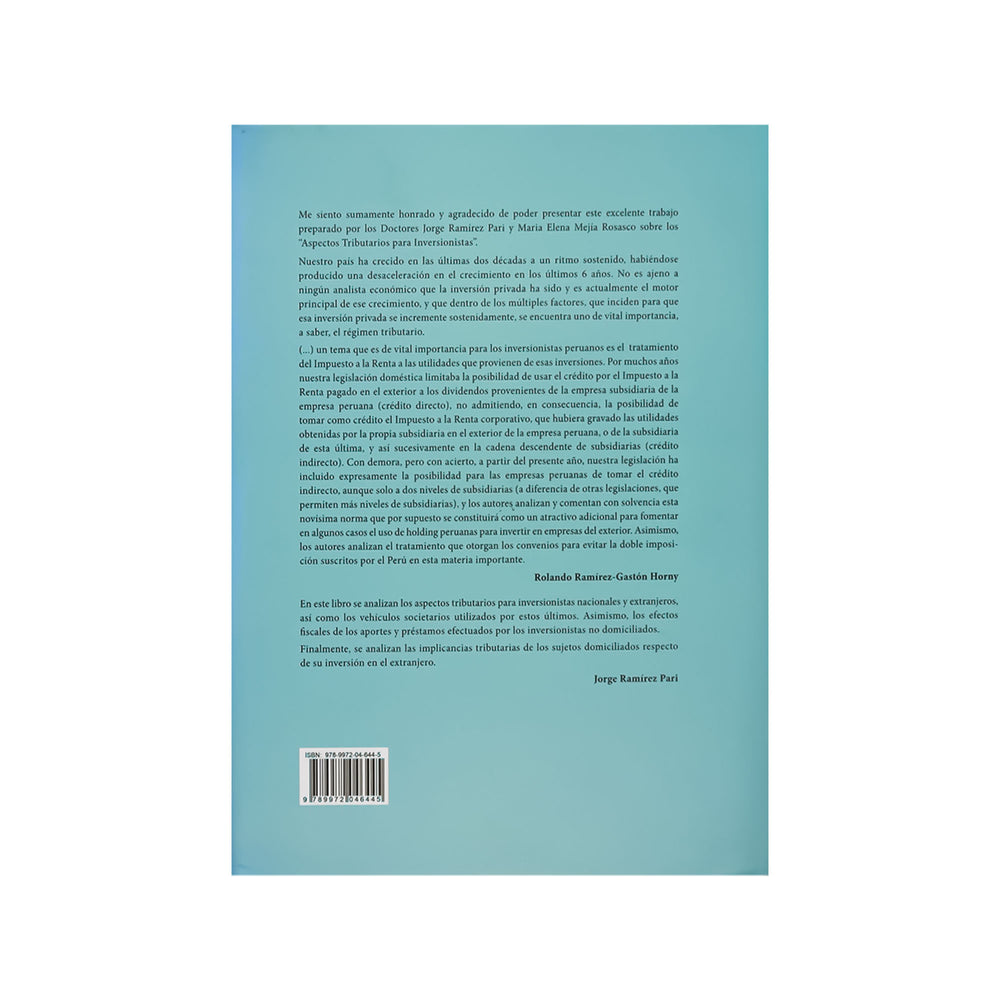 En este libro se analizan los aspectos tributarios para inversionistas nacionales y extranjeros, así como los vehículos societarios utilizados por estos últimos. Asimismo, los efectos fiscales de los aportes y préstamos efectuados por los inversionistas no domiciliados. Finalmente, se analizan las implicancias tributarias de los sujetos domiciliados respecto de su inversión en el extranjero.