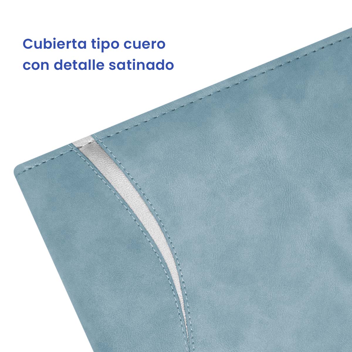 - Cubierta de biocuero con textura lisa y franja satinada.